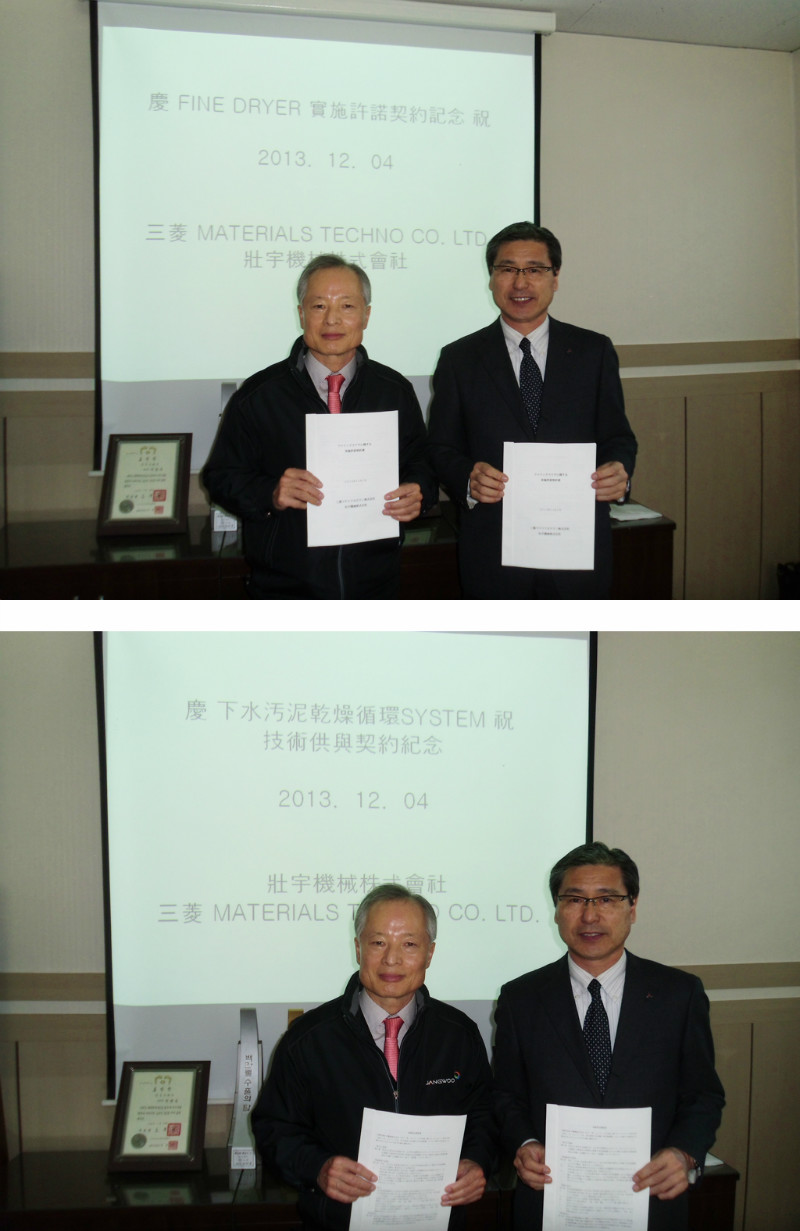 2013년 12월 04일 수요일 미쯔비시 머티리얼 테크노사와 하수오니건조순환시스템 기술공여 협약식 및 파인드라이어 실시허락계약 기념식이 당사 회의실에서 개최되었습니다.